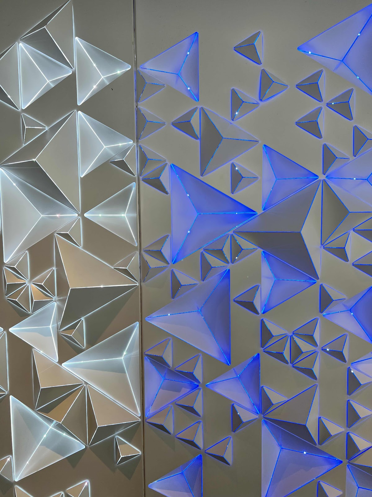 When you arrive at the GeO-Deck of Reunion Tower, one of the first things you'll notice is the unique interior design—the walls are adorned with geometric shapes that are backlit and constantly shifting in color. The subtle, ever-changing glow adds a dynamic and modern touch to the space.