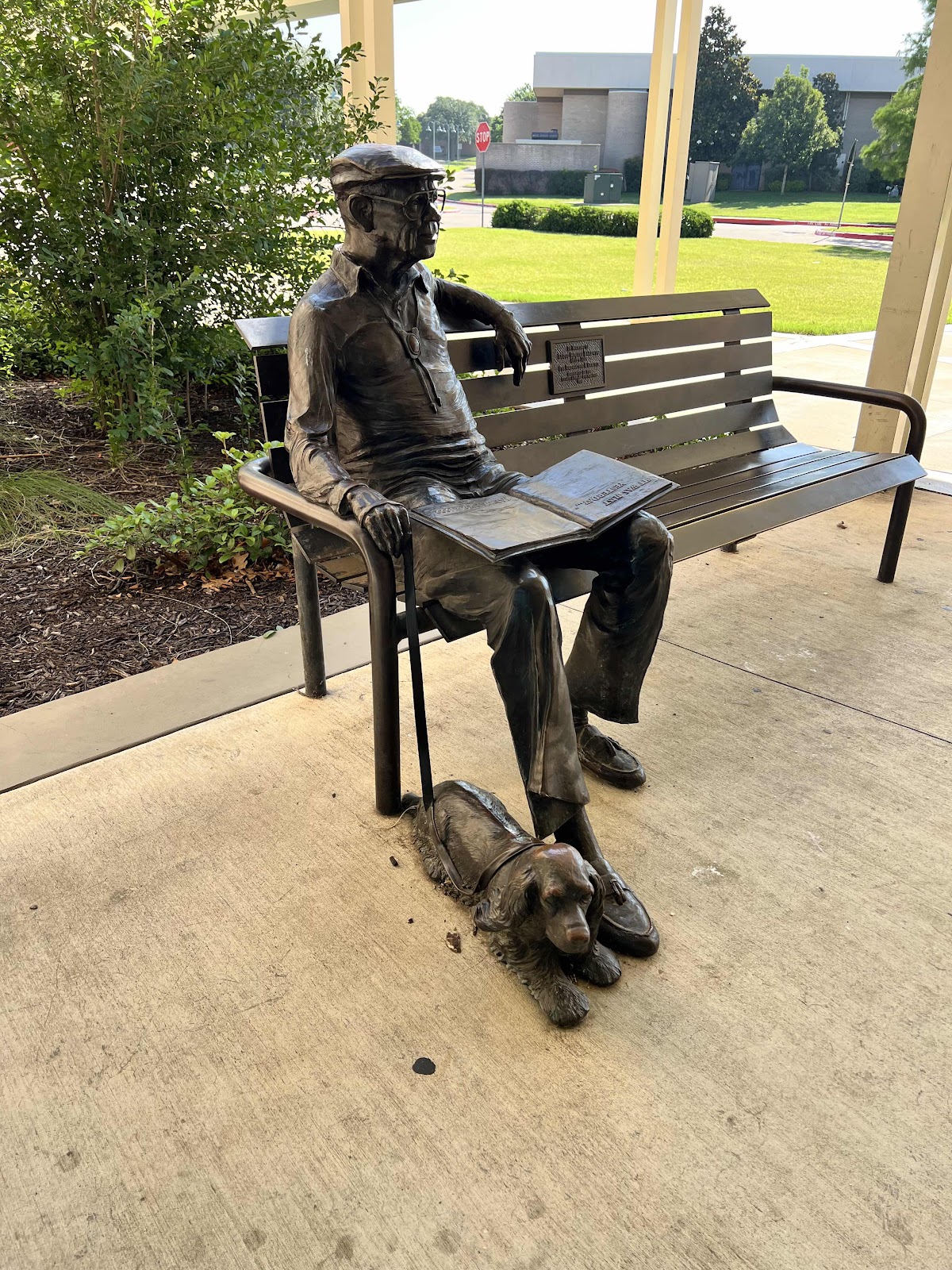 The Mary Lib Saleh Euless Public Library in Euless, TX stands out as the public library with the most monuments I’ve ever seen. Just outside its entrance, there’s a particularly touching memorial that immediately caught my attention. What makes it especially heartwarming is the inclusion of the man’s dog as part of the tribute. Even more meaningful is the fact that the dog’s head remains shiny and free of patina—clearly from the many people who have lovingly rubbed it over time. It’s a quiet, beautiful reminder of the deep bond between humans and their loyal companions.